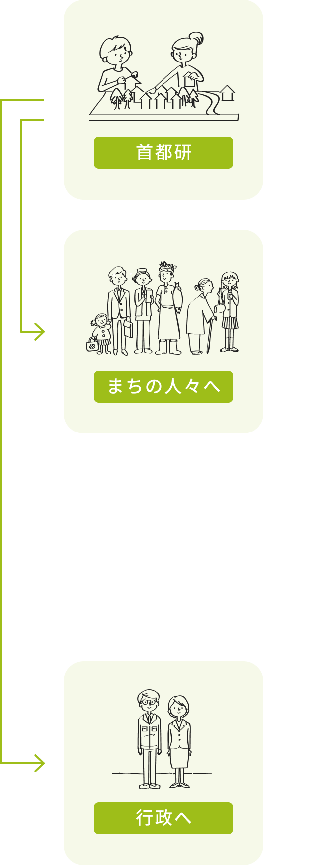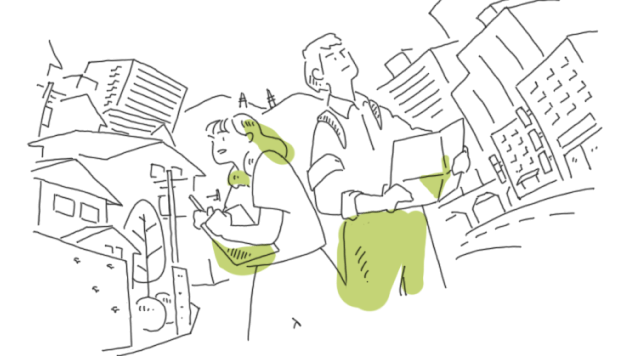 まちには、住民、商業者・事業者、そして行政といった、様々な立場の主体が関わっています。私たちはその間に立ち、それぞれの声を聞きながら橋渡しをするとともに、そのまちにとってベストの解を探っていきます。