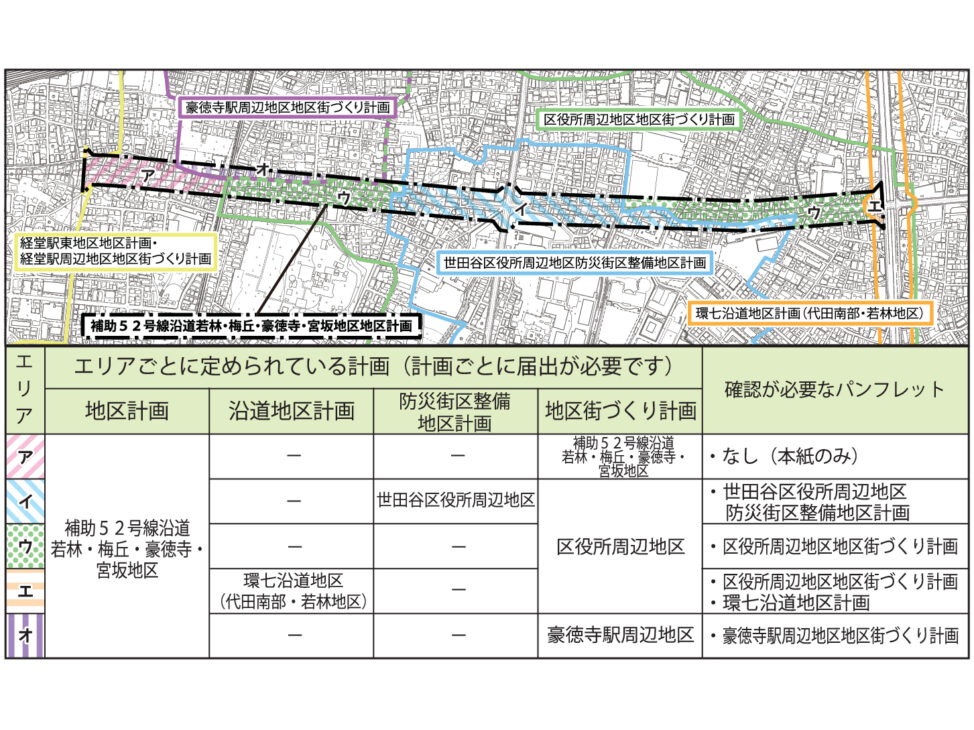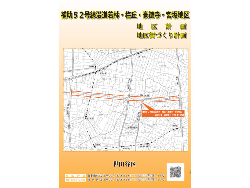 補助52号線(環状七号線~補助128号線の交差部)は、世田谷区若林、梅丘、豪徳寺、宮坂の各町を通過する都市計画道路で、「淡島通り」の延伸部分に位置します。