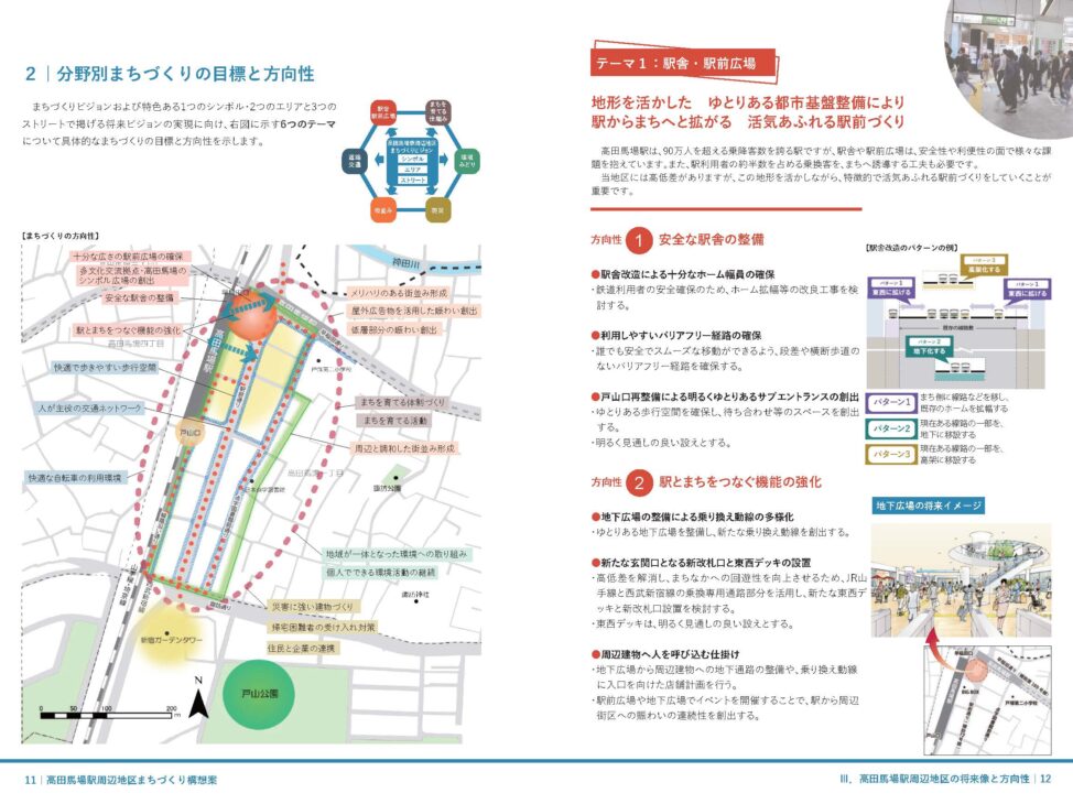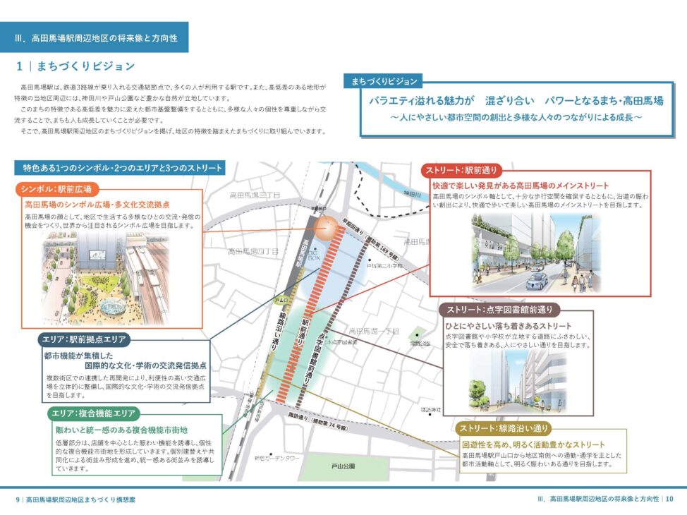 高田馬場駅周辺地区は、都内主要ターミナル駅に次ぐ乗降客数を誇り、大久保三丁目の開発や都市計画道路の拡幅整備を契機に歩行者が増加するなど、地区を取り巻く環境が大きく変わりつつあります。一方で、手狭な駅前広場や更新時期を迎えた建物のあり方が課題となっています。