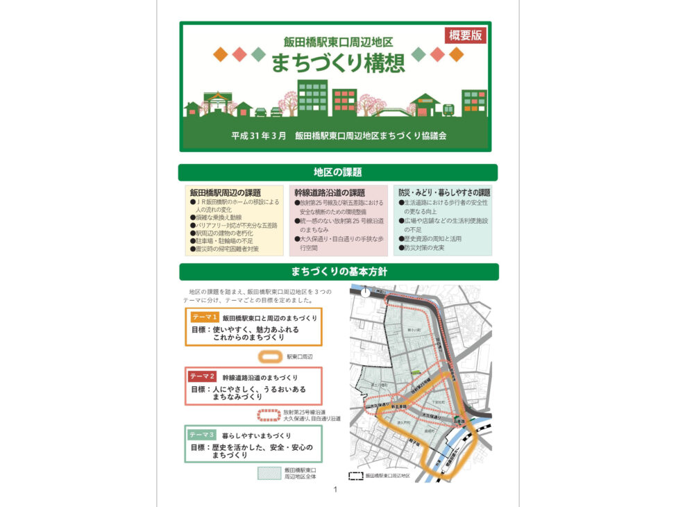 首都研では、土地・建物権利者、居住者、営業者等で構成するまちづくり協議会の運営等を支援し、まちの目標や方向性について、2019(H31)年3月に地元案として「飯田橋駅東口周辺地区まちづくり構想」のとりまとめを支援しました。