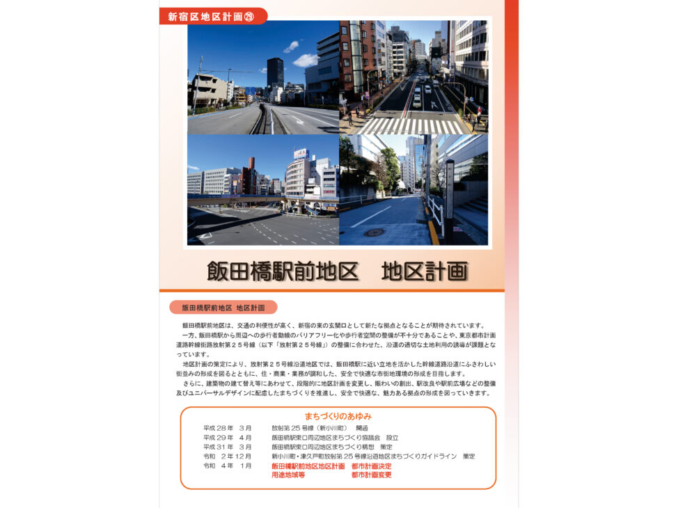 業務実施当時、飯田橋駅周辺地区では、JR飯田橋駅のホーム移設工事や放射第25号線の開通等のまちを取り巻く状況の変化や、駅とまちをつなぐバリアフリー対応の遅れ、飯田橋東口五差路の歩道橋の老朽化等のまちの課題への対応が求められていました。