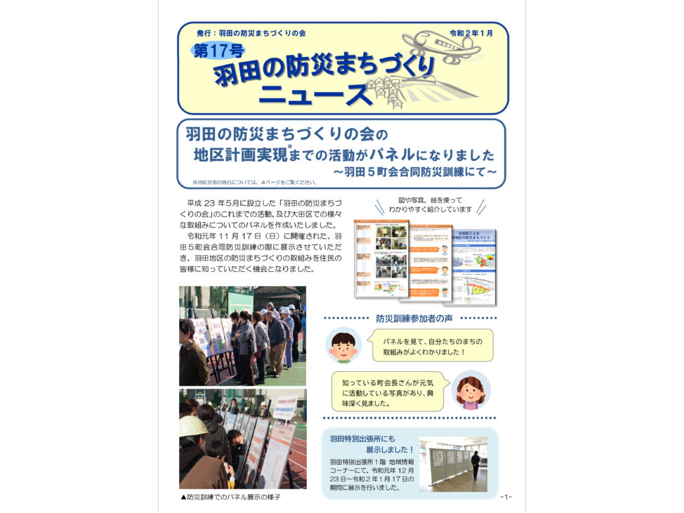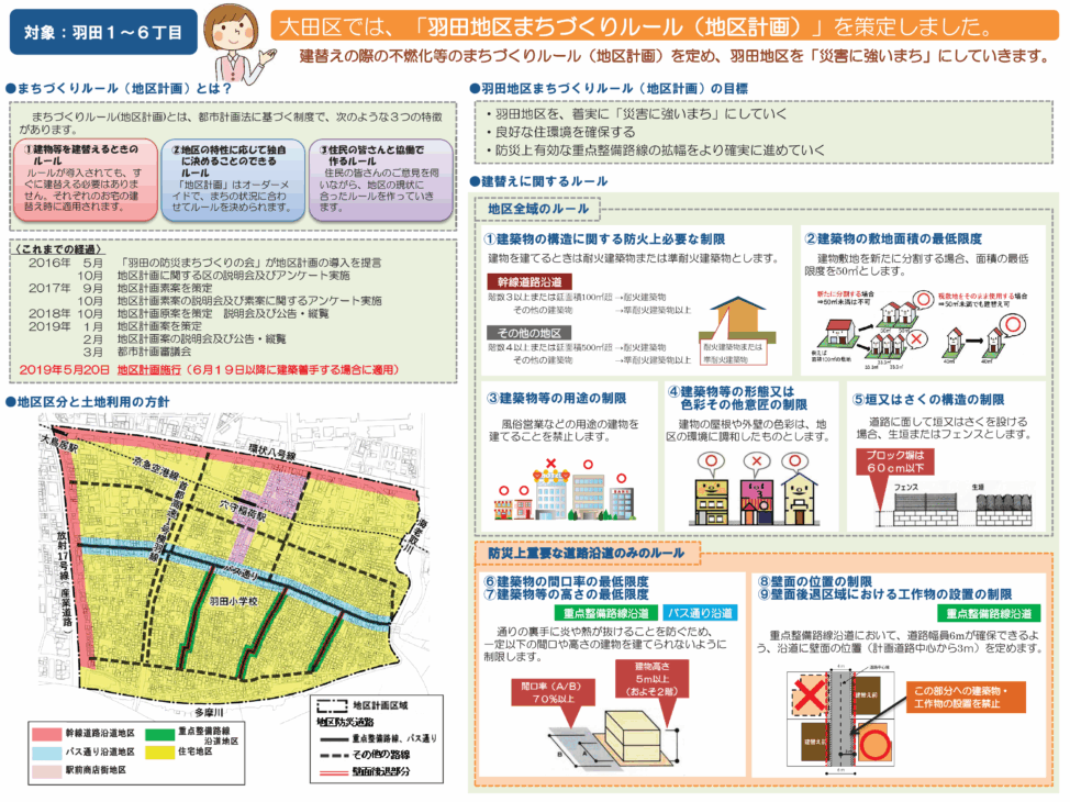 首都研では、2011(H23)年に地元住民組織「羽田の防災まちづくりの会」とともに検討を開始し、以来当地区での防災まちづくりを支援してきました。2014(H26)年に密集事業を開始し、地区内の避難路となる3本の重点整備路線(計画幅員6m)の拡幅整備が少しずつ進んでいます。また、防災街区整備地区計画の導入に向けた検討を行い、「羽田の防災まちづくりの会」をはじめとする関係権利者の合意形成を図るとともに、地区計画の決定に向けた都市計画手続きの支援を行い、2019(R01)年5月に、防災街区整備地区計画が策定されました。