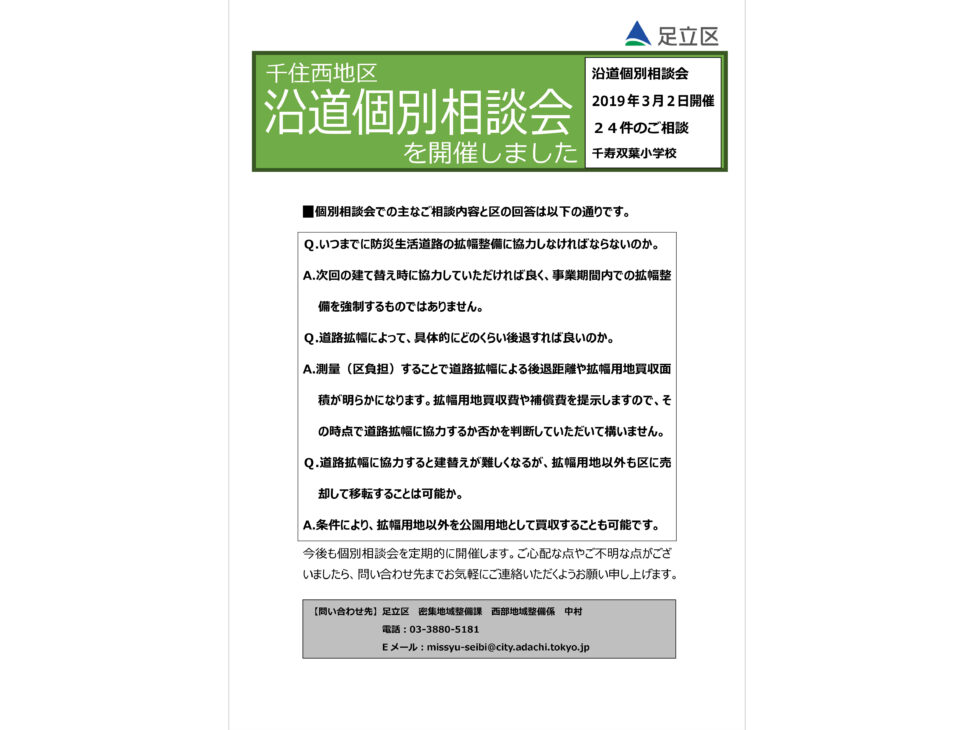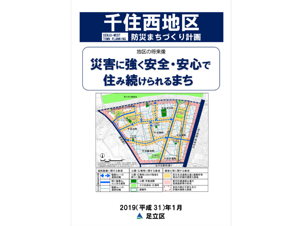 当地区は木造住宅密集地区で、住環境及び防災性向上のためのまちづくりが急務となっていました。そこで、従前に策定された「千住西地区防災まちづくり計画」の区域拡大に伴う修正をしながら、密集事業や防災街区整備地区計画の導入に向けた検討を行うため、まちづくり協議会の設立と開催、ブロック別懇談会や防災生活道路沿道部会の開催を支援しました。