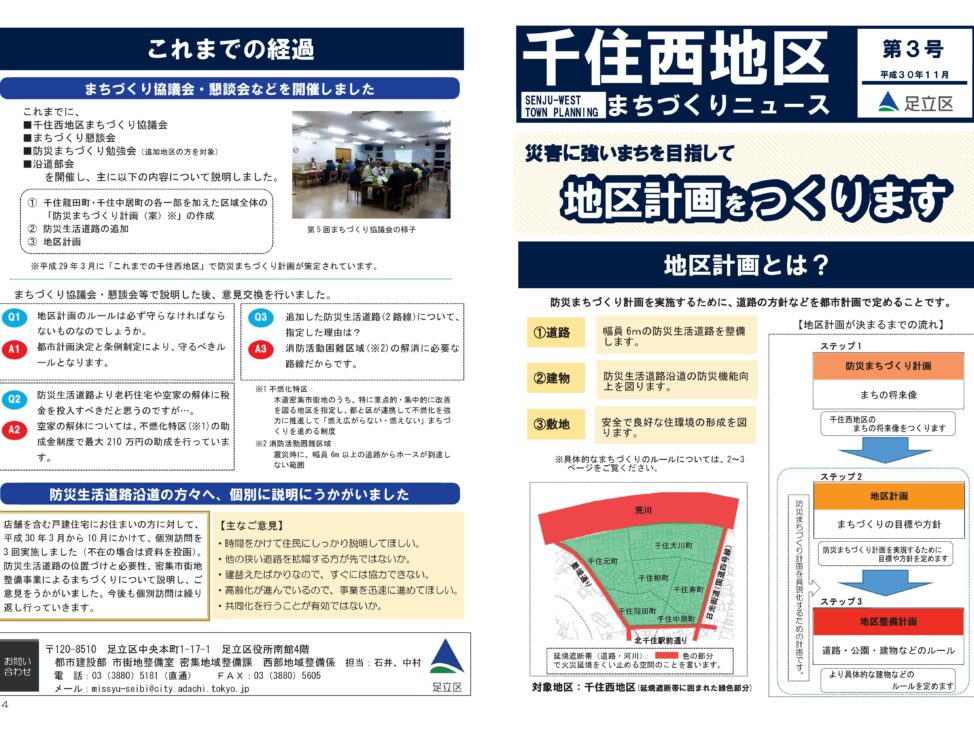 密集事業や防災街区整備地区計画の導入にあたっては関係図書の案を作成するとともに、個別相談会の開催を支援したり、地域の皆さんと情報を共有するまちづくりニュースを作成して、導入への理解を深めました(密集事業は2019(R1)年度に開始、防災街区整備地区計画は2019(R1)年7月に決定)。